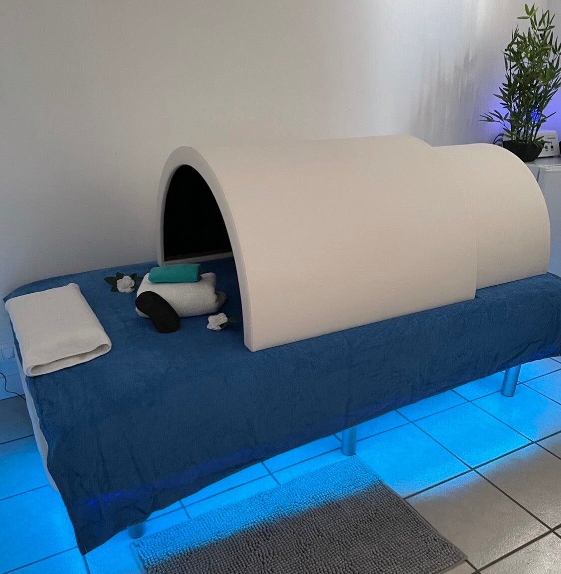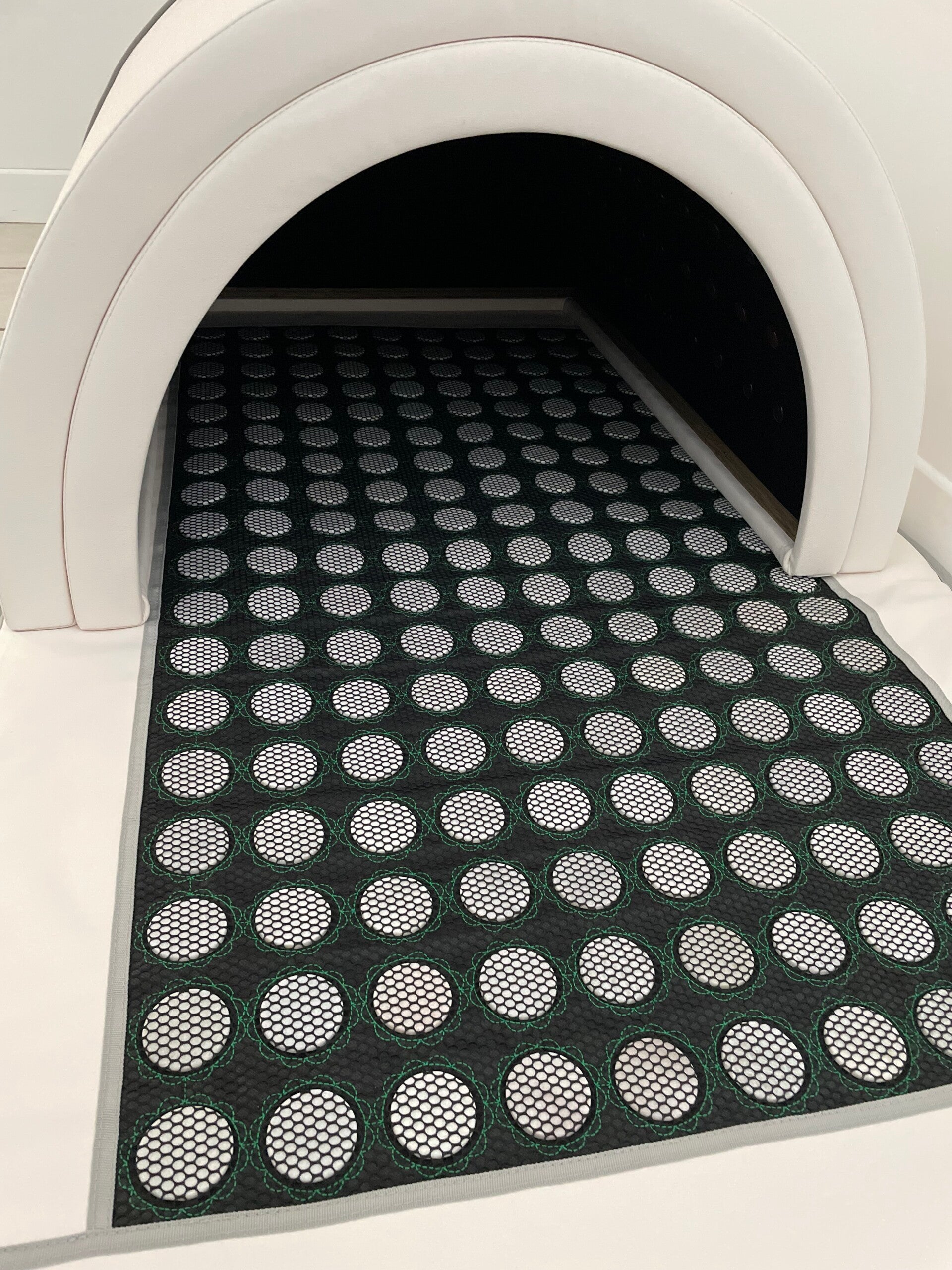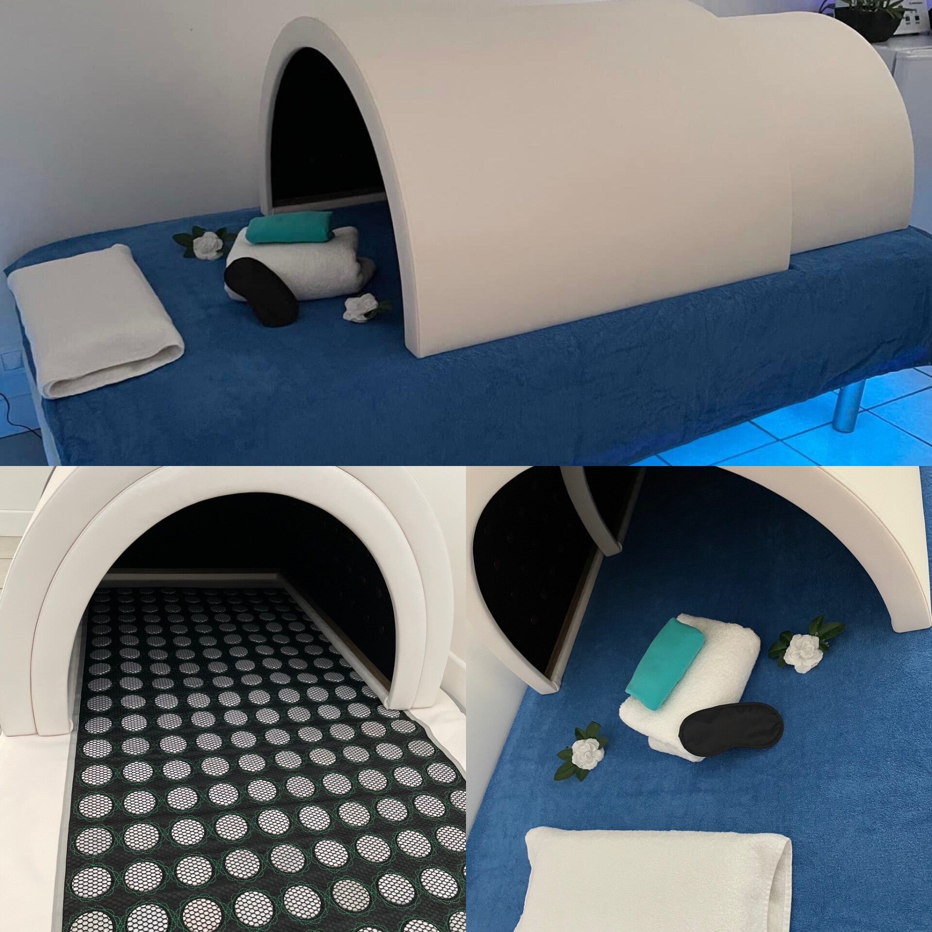 il est constitué d'un matelas chauffant et de deux dômes qui émettent des infrarouges longs, moyens, courts pénétrant les tissus du corps humain en profondeur.